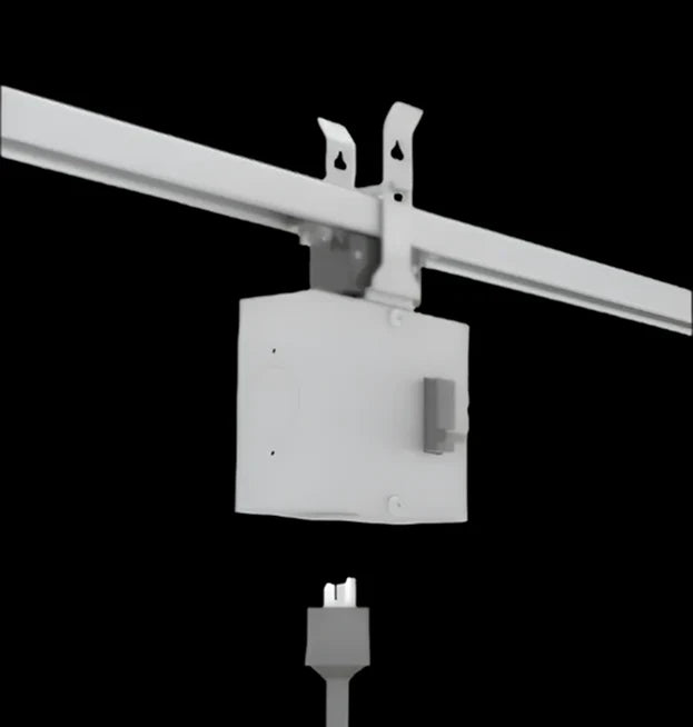 Power Tap-Off Boxes connect directly into the Track Busway system, providing flexible overhead power distribution without rewiring. These customizable plug-in units allow contractors to install quickly, while also giving facility managers the ability to add or reposition power drops over time — a cost-saving alternative to conduit-based systems