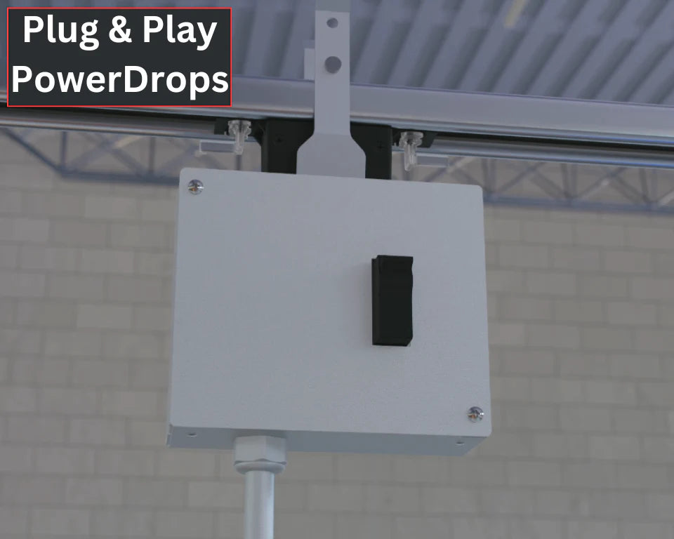 Plug-In 120V Power Drops – The Steel Track Busway system provides a continuous access slot for plug-in units. It provides quick and precise overhead power distribution. This solution ensures power drops are placed exactly where they’re needed and supports evolving layouts in laboratories and makerspaces.